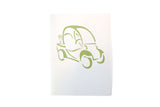 The base of the card is purposefully made green to mimic grass, and the central vehicle is the golf buggy including two sets of clubs in the back in addition to carefully detailed etching on the base of the card.